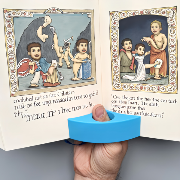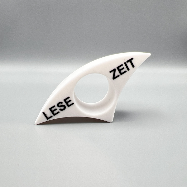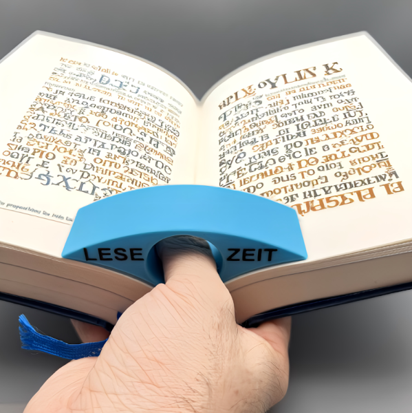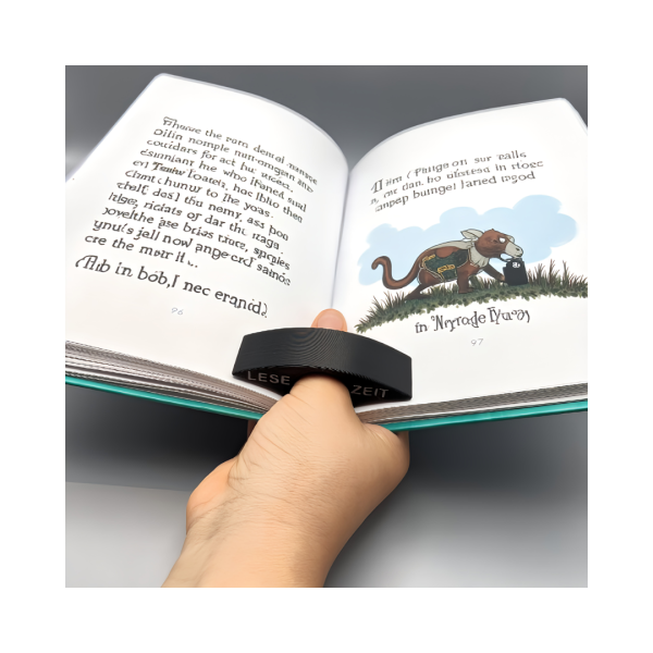 Er wurde speziell so konstruiert, dass die Buchseiten nicht beschädigt werden und der Daumen keine Druckstellen bekommt. Der Buchseitenhalter fügt sich perfekt ins Buch und Ihr Daumen perfekt in den Buchseitenhalter.